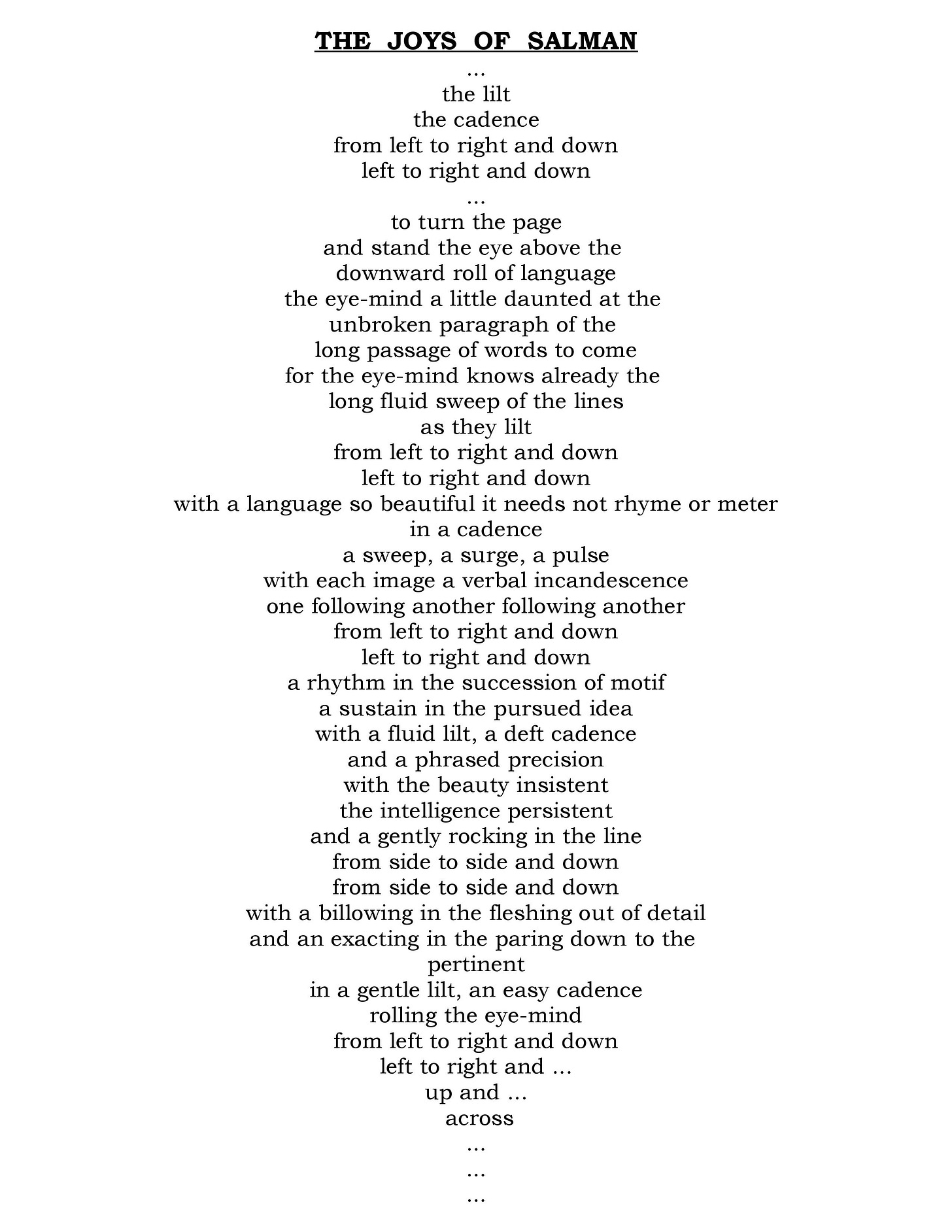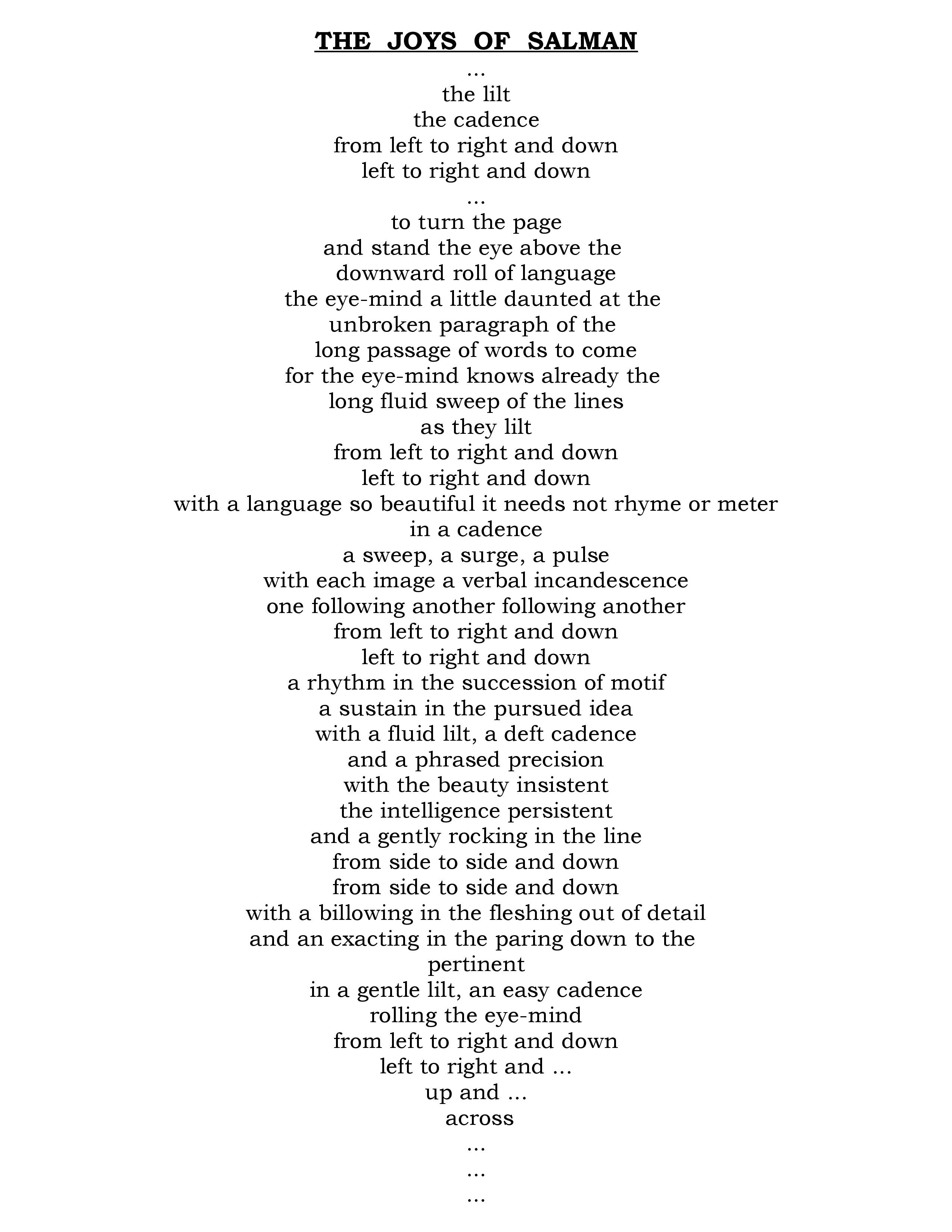 He knows so much, that Salman, the knowledge keeps coming at you till you’re floating awash in a lyrical delirium growing within for as long as his ever-extending semi-ecstatic sentences...